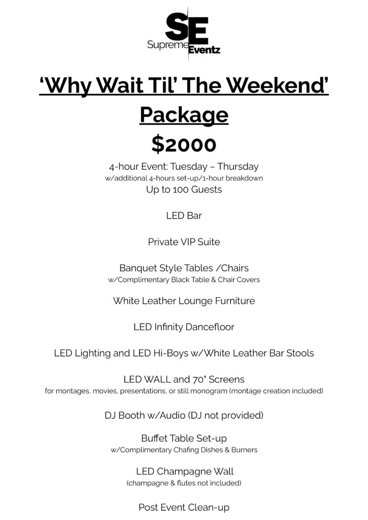 Looking to rent an amazing space to host your next event? The Supreme Eventz Space is a 5500+ sq. ft. turnkey ready venue that offers a traditional banquet-style layout or our highly sought after signature ‘exclusive contemporary lounge’ setting. The space can be suited to accommodate any private affair.